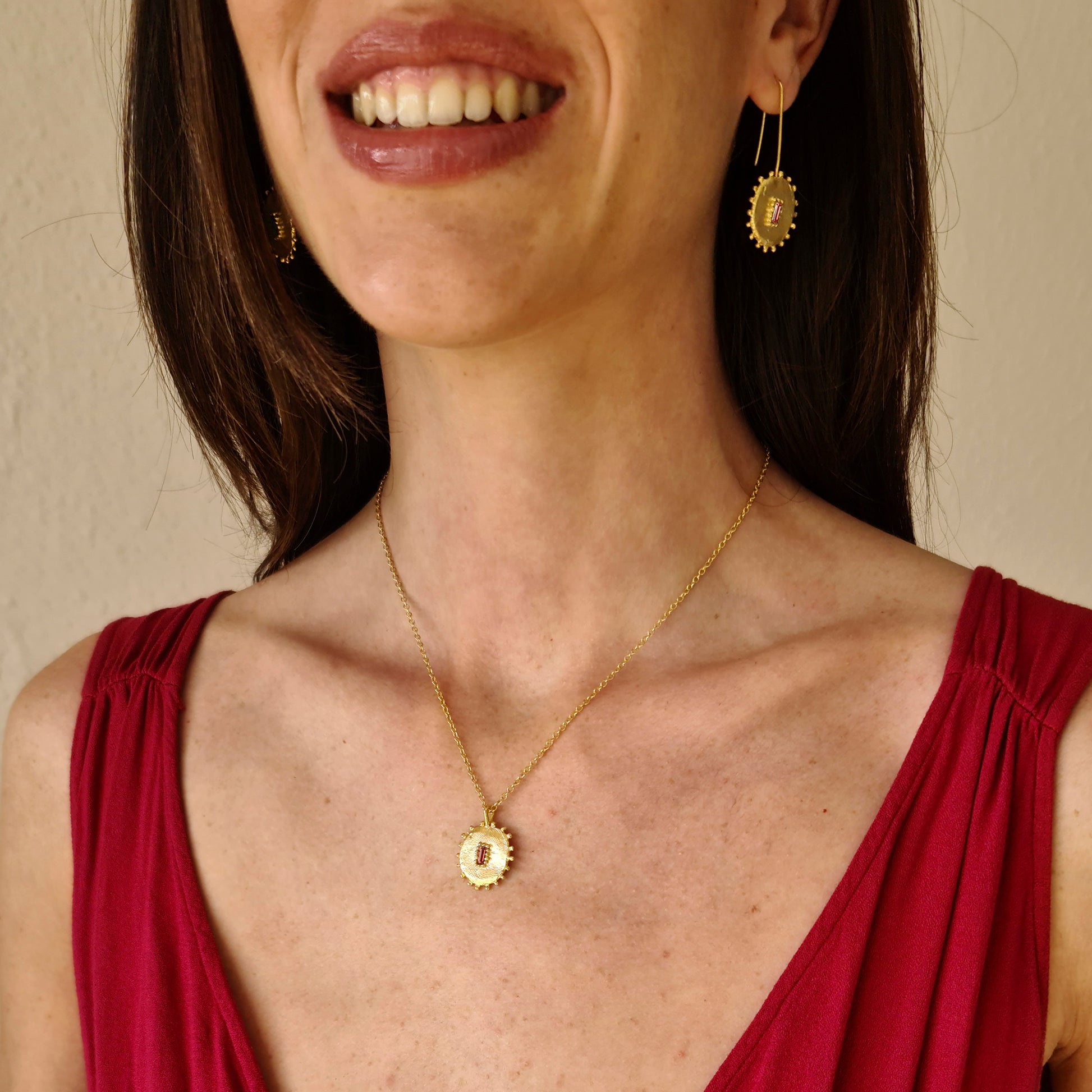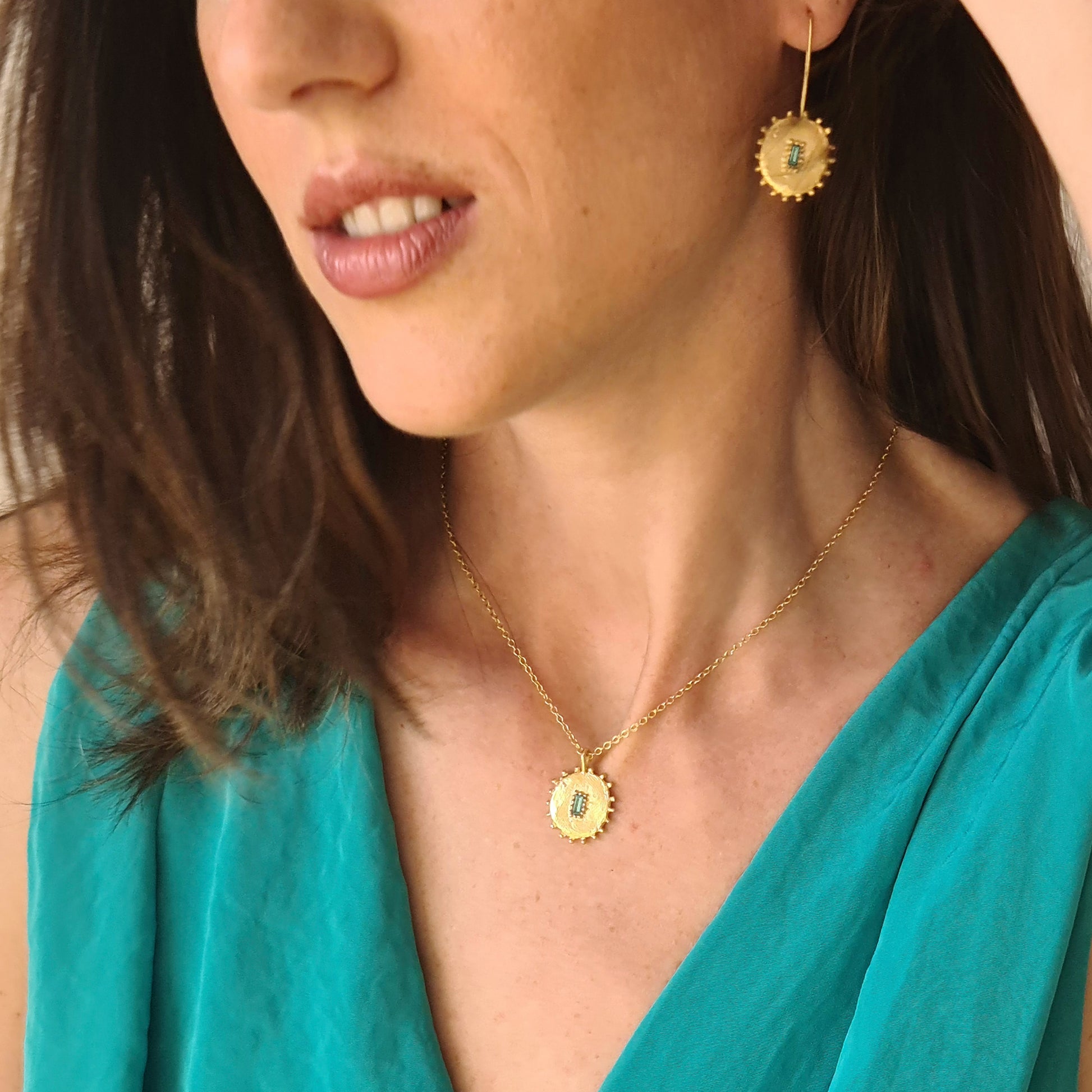 El estilo del colgante o pendientes combinado con los cristales de colores; verde esmeralda, azul aguamarina, rosa cálido y suave, y negro azabache le dan un toque sofisticado a cada una de las piezas.